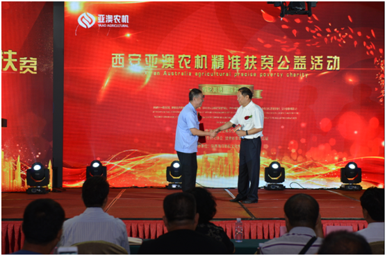 開機儀式上,中國農(nóng)機化協(xié)會還就“甘肅省蘭州市永登縣”精準扶貧工作給予亞澳高度的認可。永登縣團莊村屬干旱貧困山區(qū),全村現(xiàn)有7個村民小組,421戶、1696人。近年來,幫扶單位先后捐贈了30多臺(套)特色農(nóng)機具,但仍缺少大中型農(nóng)機具,農(nóng)機化服務能力不足,不能滿足農(nóng)業(yè)生產(chǎn)需求。此次中國農(nóng)業(yè)機械化協(xié)會聯(lián)合亞澳公司等有關單位向團莊村捐贈價值40多萬元農(nóng)業(yè)機械,必將對團莊和周邊鄉(xiāng)村農(nóng)業(yè)和農(nóng)村經(jīng)濟發(fā)展、全面建設小康社會起到很大地推進作用。