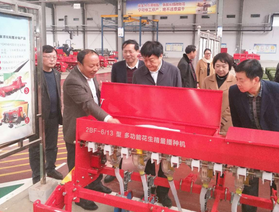 參觀過程中,劉樹華部長親切的向郭總咨詢公司的產(chǎn)品,郭總向劉樹華部長簡述了2BF-6/13 多功能花生精量播種機的功能構(gòu)造,在得知該款機型當(dāng)年投產(chǎn)當(dāng)年熱銷后,劉部長十分高興的對郭總說:“亞澳要進一步開展科技研發(fā)工作,多培養(yǎng)、招聘科研人員,增強自身科研力量,成為農(nóng)機具行業(yè)的標(biāo)桿”,周天龍縣長對劉樹華部長說:“縣政府已批給亞澳30多畝土地,作為亞澳的科技研發(fā)中心”。
