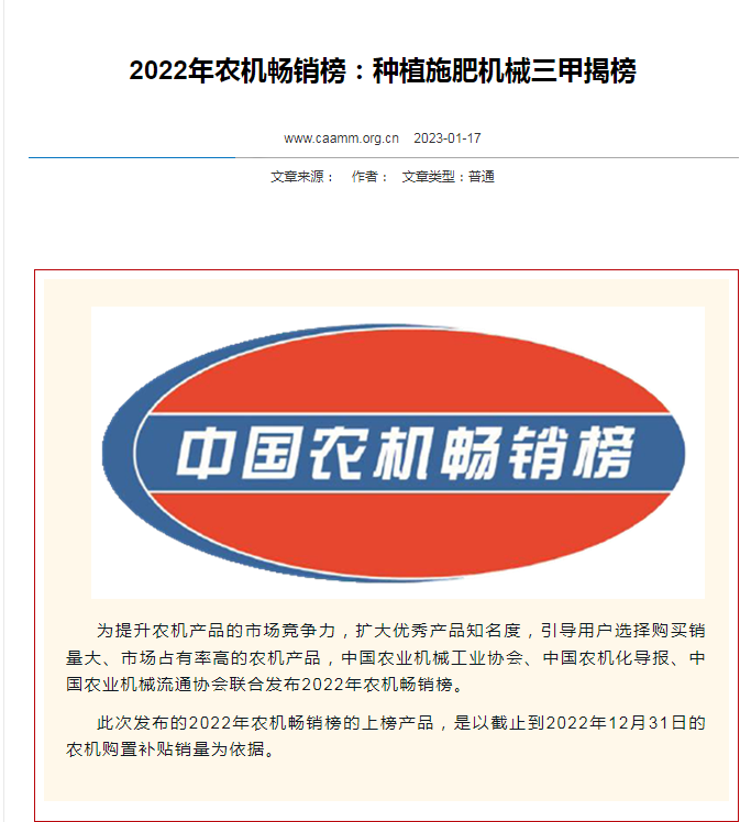 據(jù)中國農(nóng)機(jī)網(wǎng)最新消息,為提升農(nóng)機(jī)產(chǎn)品的市場競爭力,擴(kuò)大優(yōu)秀產(chǎn)品知名度,引導(dǎo)用戶選擇購買銷量大、市場占有率高的農(nóng)機(jī)產(chǎn)品,中國農(nóng)業(yè)機(jī)械工業(yè)協(xié)會(huì)、中國農(nóng)機(jī)化導(dǎo)報(bào)、中國農(nóng)業(yè)機(jī)械流通協(xié)會(huì)聯(lián)合發(fā)布2022年農(nóng)機(jī)暢銷榜。亞澳農(nóng)機(jī)進(jìn)入耕整地機(jī)械和種植施肥機(jī)械農(nóng)機(jī)暢銷雙料三甲榜。